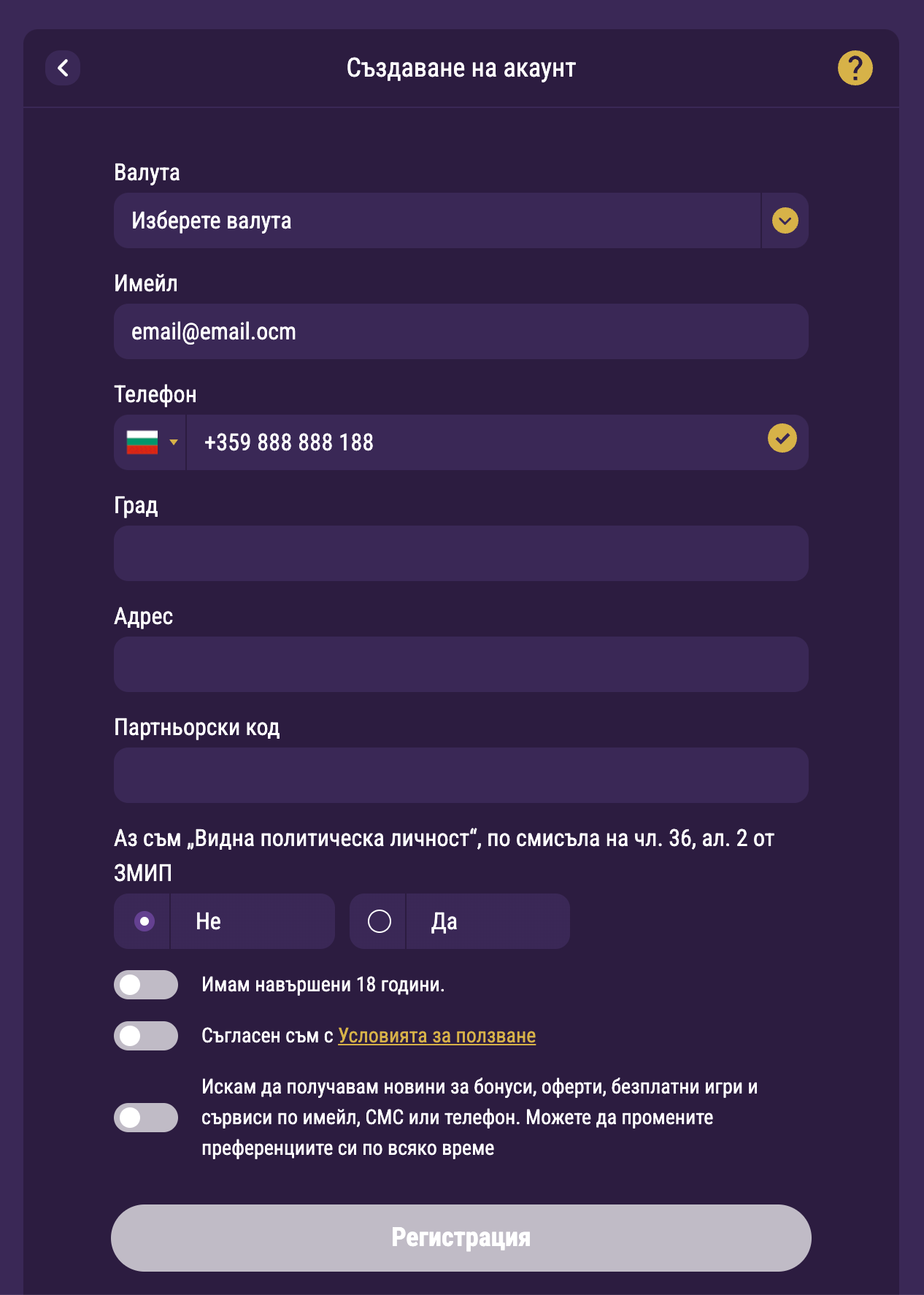 Потвърди, че си навършил 18 години, че не си видна политическа личност и приеми общите правила и условия. Накрая, натисни върху бутона за завършване на регистрацията. Ще получиш имейл за потвърждение – кликни върху линка в него, за да активираш акаунта си.